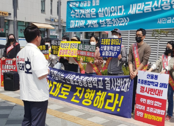 이날 6-3 생활권 입주예정자들은 교육청의 산울초․중 통합학교 설립계획에 전면 반대하며 산울초등학교와 산울중학교를 원안대로 개교해 달라는 입장문을 발표했다.