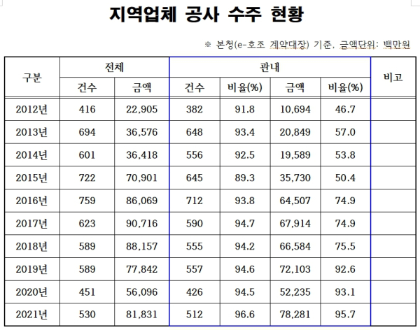 조한섭 회계과장은 5일 “지난 10년간 관내업체 수주율이 꾸준히 높아진 것은 지역 경제 활성화뿐만 아니라 지역 업체의 시장 경쟁력 강화에도 큰 도움이 됐다”라며 “앞으로도 지역 업체를 위한 제도개선 등 지속적인 시책을 발굴하고 운영할 것”이라고 밝혔다.