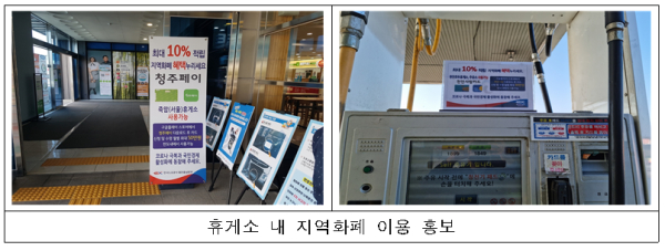또한, 최근 소비자 필수템이 된 지역화폐의 휴게소 이용환경도 개선하고 있다. 현재 대전충남 관내에서는 16개 휴게소와 14개 주유소에서 지역화폐를 이용할 수 있다. 한국도로공사 대전충남본부는 이용고객을 대상으로 휴게소 지역화폐 이용 홍보를 강화함과 동시에 지자체와 휴게소간 업무협의를 통해 지역화폐 가맹 추가 등록을 지속적으로 확대해나갈 방침이다.