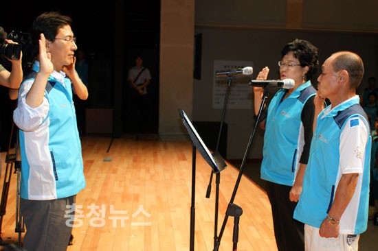 오후3시부터 진행된 자원봉사자 교육이 끝난 후 발대식을 위해 안희정 충남도지사, 유병기 충남도의회 의장, 권오룡 엑스포조직위원장, 박동철 금산군수, 한찬희 조직위 사무총장 등 내빈이 등장하자 자원봉사자들은 뜨거운 박수를 보냈다.