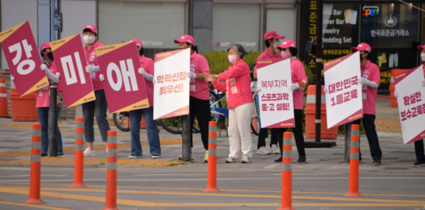 강 후보는 ▲학력신장 최우선 ▲북부지역 스포츠 과학, 중고설립 ▲대한민국 1등 교육 ▲확실한 보수교육감 새겨진 피켓을 들고 지지를 호소했다.