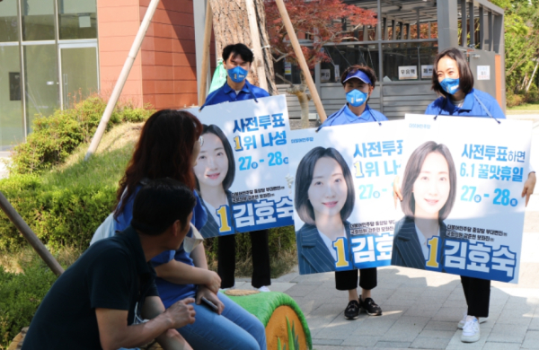 더불어 27일부터 이틀간 진행되는 사전투표 참여율을 높이기 위해 아파트 단지를 돌며 적극적인 홍보활동을 펼치고 있다.