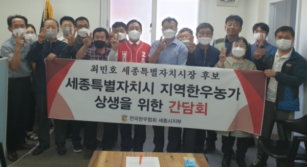 [충청뉴스 최형순 기자] 전국한우협회 세종시지부 회원과 한국노총 전국건설연대노동조합은 26일 최민호 국민의 힘 세종시장 후보 사무실에서 간담회를 갖고 지지를 선언했다.