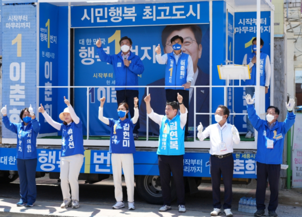 이번 집중유세에는 이춘희 세종시장 후보를 비롯한 강준현 세종시당위원장과 홍성국 국회의원 및 시의원 후보들이 함께 참여했다.