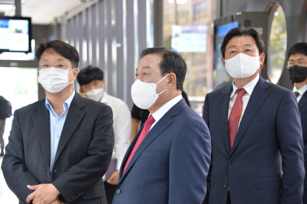 배준석 세종도시교통공사 사장으로 부터 설명을 듣고 있는 최민호 시장과 이준배 부시장
