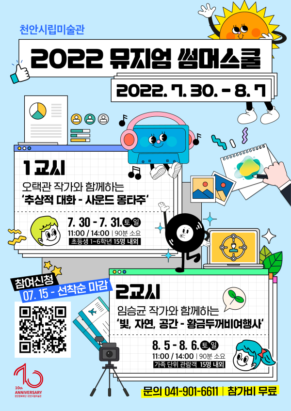 [충청뉴스 최형순 기자] 천안문화재단 천안시립미술관은 "여름방학을 맞아 7월 30일부터 8월 6일까지 미디어특별전 ‘휴먼 오디세이’와 연계한 어린이 교육프로그램 ‘2022 뮤지엄 썸머스쿨’을 운영한다"고 13일 밝혔다.