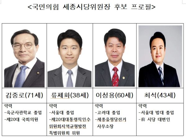 이번 세종시당 위원장 선거에는 김중로 현 시당 위원장을 비롯해 류제화 전 세종시장직 인수위원회 대변인, 이성용 전 세종시당 부위원장, 최석 전 세종시의원 선거후보 등 4명이 출마 의사를 밝힌것으로 집계됐다.