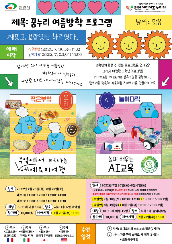 주요 프로그램으로 △세계요리여행 △스마트로봇으로 블록코딩 △자율주행 스마트카 제작 △캐릭터 색칠하기 △알록달록 나만의 부채만들기 등이 준비됐다.