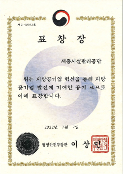 계용준 이사장은 “시설물 관리에 첨단기술을 적용하는 등 지속적인 혁신 노력에 대한 성과를 인정받아 매우 기쁘다”며, “앞으로도 세종시민을 위한 혁신 성과 창출에 최선을 다하겠다”라고 밝혔다.