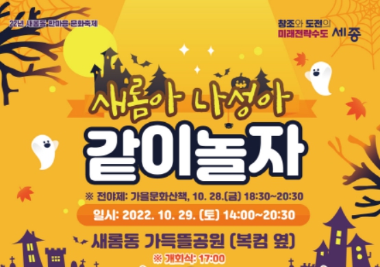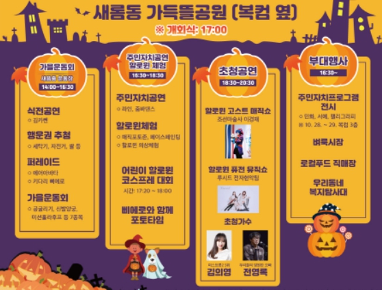 이어 오후 5시 개회식을 시작으로 밤 8시 30분까지 가득뜰 근린공원에서 진행하는 문화나눔축제는 어린이 할로윈 코스프레 대회, 할로윈 고스트 매직쇼, 퓨전 뮤직쇼는 물론, 가수 김의영·전영록 초청공연이 진행된다.