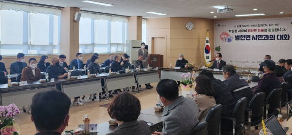 박상돈 시장은 22일 병천면을 찾아 홍성현 충남도의회 부의장, 류제국 천안시의원을 비롯해 병천면 주민 대표와 시 관계자 등 60여 명이 참석한 24번째 시민들과의 간담회에서 이같이 밝히며 폐기물 시설 허가에 대해 ”산업통상자원부에 거부 의사를 분명히 밝힐 것“이라고 강조했다.