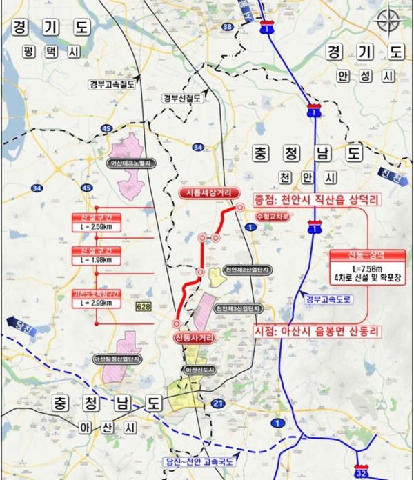 박완주 의원실에 따르면 이 사업은 아산시 음봉면 산동리부터 천안시 직산읍 상덕리 시름세삼거리까지 총사업비 1,286억원을 들여 7.74km 구간을 4차로로 확포장하는 사업이다.