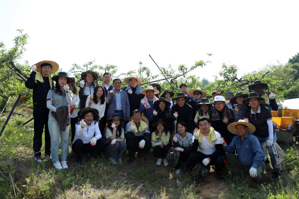 봉사활동 참가자들은 복숭아 농장주의 지도로 복숭아 품질 향상을 위한 꽃 솎는 작업에 구슬땀을 흘렸다.