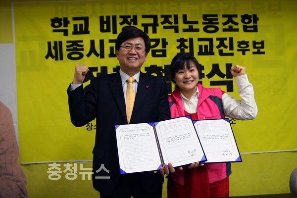 최교진 세종시 교육감 후보는 19일 전국학교비정규직노조 충남지부와 ‘비정규직 없는 학교’ 실현을 위한 공약 협약을 체결했다.