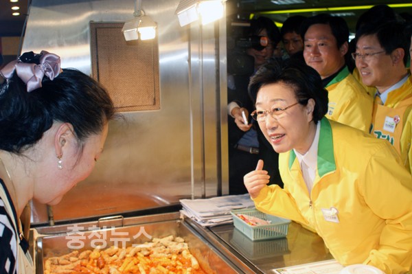 ▲ 한명숙 대표가 지하상가의 한 떡복이집 사장님과 대화를 나누고 있다.