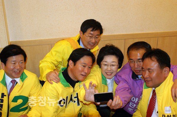 ▲ 기자간담회가 끝난뒤 한명숙 대표가 후보자들과 셀카를 찍고 있다.