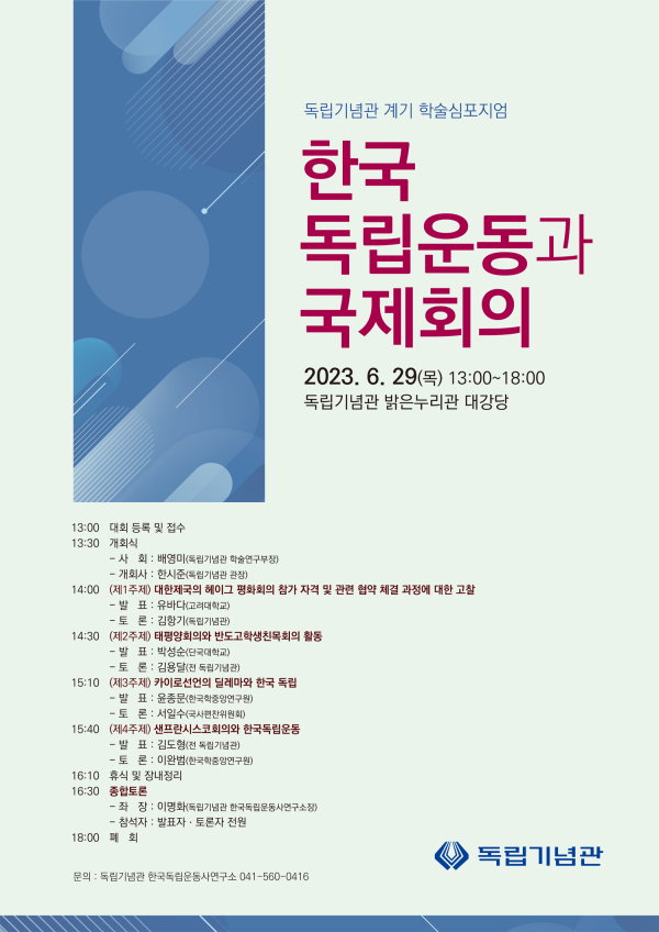 [충청뉴스 박동혁 기자] 독립기념관은 오는 29일 독립기념관 밝은누리관에서 ‘한국독립운동과 국제회의’를 주제로 학술심포지엄을 개최한다고 밝혔다.