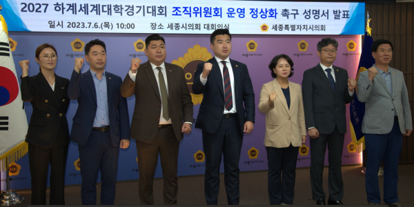 세종특별자치시의회 2027 하계세계대학 경기대회 추진 특별위원회 위원들은 6일 의회 대회의실에서 조직위원회 정상 운영을 촉구하고 나섰다.