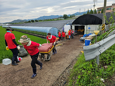 특히, 청양 ‧ 논산 ‧ 부여지역은 하천이 범람하거나 뚝이 붕괴되어 축사 및 농작물 침수피해가 큰 지역으로 자원봉사자의 50%이상이 축사 및 농작물 복구활동에 배치되어 비닐하우스 정리 및 철거, 메론‧수박 등 수해로 폐기되는 농작물 정리와 축사 분뇨 제거 등 구슬땀을 흘렸다.