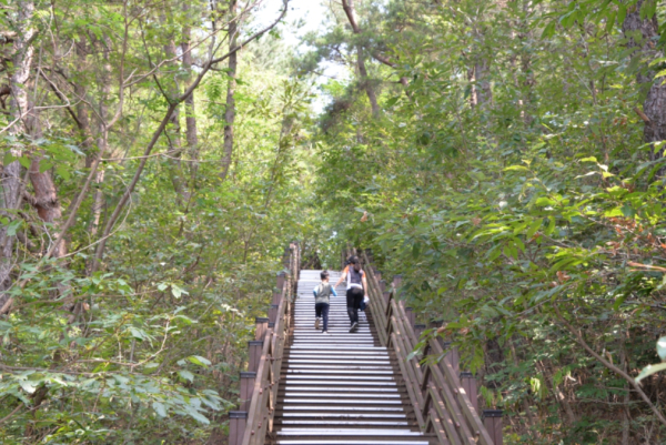 등산로 입구에 설치한 계단을 오른다. 곧이어 녹음이 우거진 숲속에 들어가니 이내 온 몸이 시원해지면서 한여름의 열기를 식혀준다. 숲속 등산길을 쉬엄쉬엄 오르면서 정겨운 매미 우는 소리를 듣는다.