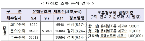 이번 발령은 대청호 추동 수역의 유해남조류 세포수가 경계발령 기준(10,000세포/mL)을 2회 연속 초과함에 따른 것이다.