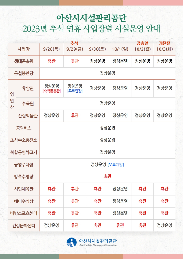 [충청뉴스 박동혁 기자] 아산시시설관리공단(이하 공단)은 추석 명절 기간 시민들의 안전한 시설 이용을 위해 ‘추석 명절 운영계획’을 수립했다고 19일 밝혔다.