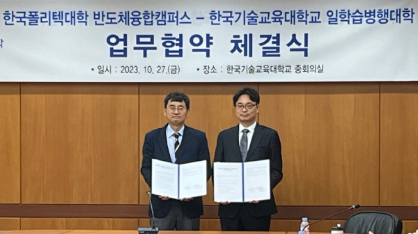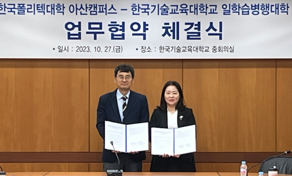 [충청뉴스 박동혁 기자] 한국기술교육대학교(이하 한기대) 일학습병행대학은 지난 27일 본교에서 한국폴리텍대학 아산캠퍼스·반도체융합캠퍼스 산학협력처와 ‘일학습병행 경력개발 고도화 사업을 위한 업무협약’을 체결했다고 밝혔다.