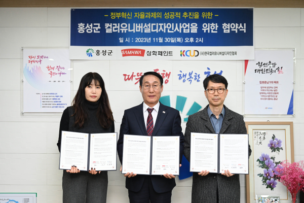 [충청뉴스 권상재 기자] 홍성군은 삼화페인트공업(주), (사)한국컬러유니버설디자인협회와 정부혁신 자율과제 ‘컬러유니버설디자인사업’의 성공적 추진 및 지속 가능한 발전을 위해 30일 업무협약을 체결했다.