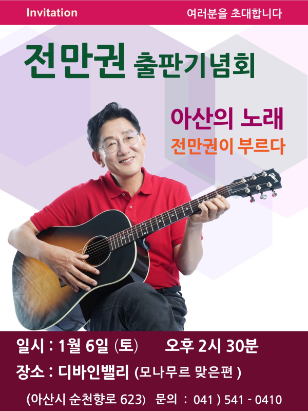 또한, 본인 삶의 진솔함을 책에 담아 꿈과 희망을 함께 이야기하기 위해 출판기념을 마련하게 되었다며, 저 전만권이 부르는 ‘아산의 노래’를 함께 들어 주시면 감사하겠다“고 초대의 인사를 전했다.