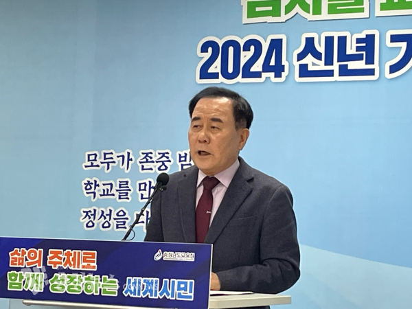 김지철 교육감은 이날 도교육청 1회의실에서 신년 기자회견을 열고 “올해 충남교육청의 교육지표는 ‘삶의 주체로 함께 성장하는 세계시민’”이라고 밝혔다.