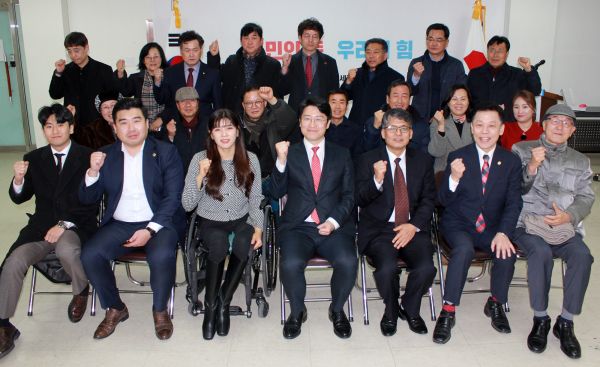 당원들과 파이팅 하는 류제화 당협위원장과 당원들