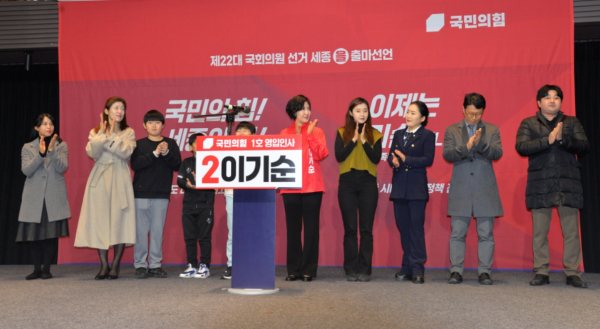 국민의힘 비대위 첫 영입인사인 이기순 전 여성가족부 차관이 23일 세종특별자치시 조치원 1927 복합문화공간에서 제22대 국회의원 선거 세종(을) 선거구에 출마를 공식 선언했다.