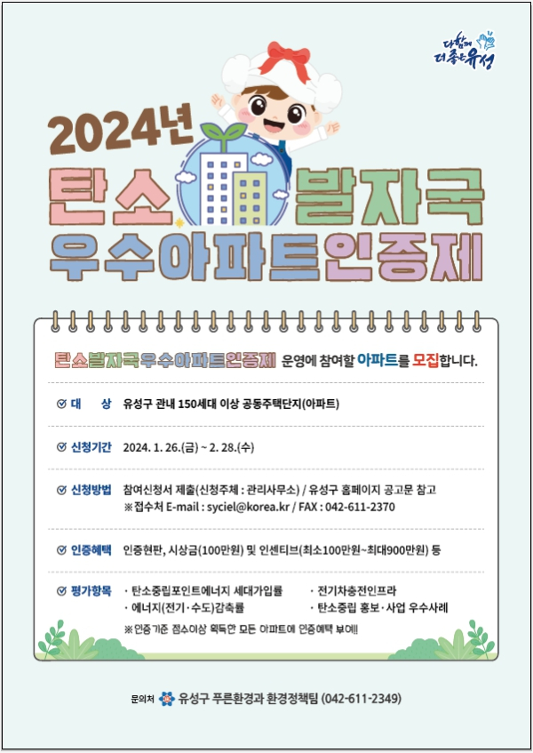 [충청뉴스 박영환 기자] 대전 유성구(구청장 정용래)는 2050 탄소중립 실현을 위한 지역 공동체 중심 사업의 일환으로 2024년 탄소발자국 우수아파트 인증제를 운영한다고 전했다.