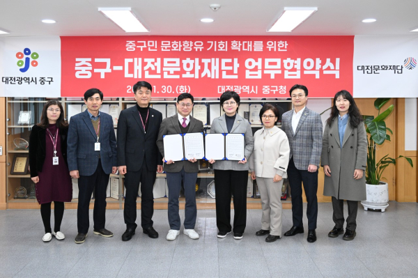 [충청뉴스 박영환 기자] 대전 중구(구청장 권한대행 이동한)는 30일 구민의 문화향유 기회 확대에 앞장서고자 대전문화재단과 업무협약을 맺었다고 밝혔다.