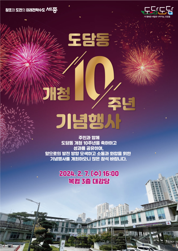 이종엽 도담동장은 “이번 행사는 도담동 10년의 성장을 기반으로 세종시의 미래를 다짐하는 뜻깊은 시간이 될 것”이라며 “앞으로도 도담동이라는 이름에 걸맞게 어린아이가 아무 탈 없이 잘 자라는 야무지고 탐스러운 동을 만들도록 주민들과 함께 최선을 다하겠다”라고 말했다.