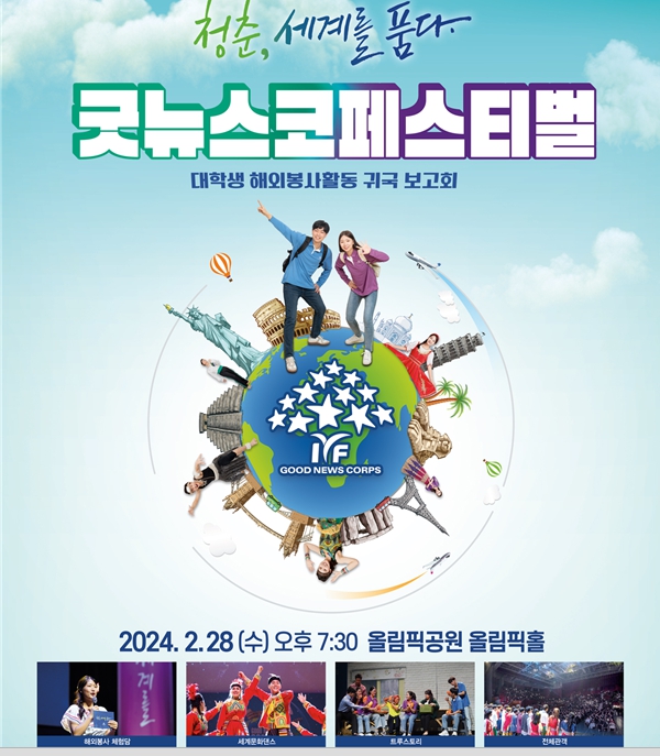 영남대 천마아트센터를 시작으로 전국 12개 도시에서 열리는 2024 굿뉴스코 페스티벌은‘청춘, 세계를 품다’라는 주제로 열린다. 이 페스티벌은 1년 동안 해외에서 봉사활동을 마치고 귀국한 대학생 봉사단원들이 현지에서 배운 값진 경험과 도전으로 얻은 행복을 시민들과 나누는 데에 의미가 있다.