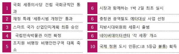 ‘2023년도 세종시 10대 뉴스’(시청 출입 언론인 대상 설문조사)는 다음과 같습니다.