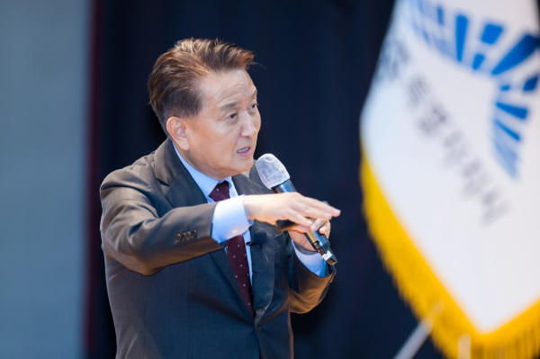 이날 3월 직원소통의 날 행사에서는 최민호 시장에 이어 김영환 충북지사가 연단에 올라 전 직원을 대상으로 ‘한반도 중심에 칩을 꽂다’라는 이름으로 특강을 펼쳤다.