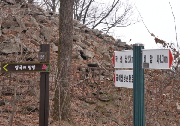 등산로 곳곳에 금이 산성을 알려주는 이정표가 있어 길을 찾기 쉽다. 비암산과 수디산을 지나 능선을 따라 계속 걷다 보면 오른쪽으로 벌목지대가 나타나면서 시원한 조망이 펼쳐진다.