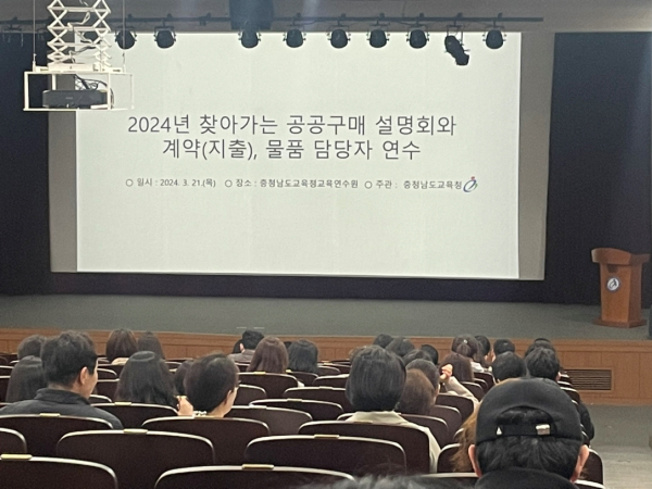 이번 연수는 충남지방중소벤처기업청 및 학교장터(S2B) 전문강사를 초빙하였고 도교육청 물품업무 담당자가 교육현장에서 업무 처리 시 간과하기 쉬운 부분 등을 집중적으로 강조할 계획이다.