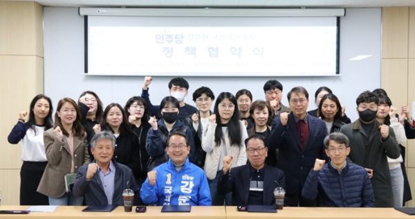 [충청뉴스 최형순 기자] 강준현 더불어민주당 세종을 국회의원 후보는 27일 4월 10일 제22대 국회의원 선거를 앞두고 세종지역자활센터, 세종특별자치시 장애인부모회, 세종시자활기업협의회 대표 및 관계자 25여명이 참석한 가운데 저소득 취약계층, 장애인 권리보장 실현을 위한 정책협약을 맺었다고 밝혔다.