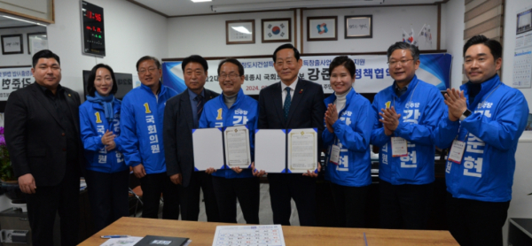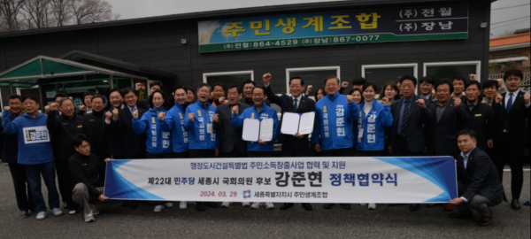 이날 정책협약은 지난 29일 오후 세종시 주민생계조합 회의실에서 이은영 조합장을 비롯한 임원들과 강준현 후보를 비롯한 김효숙, 김영현, 김재형, 안신일, 여미전, 유인호 시의원들이 참석한 가운데 진행됐다.