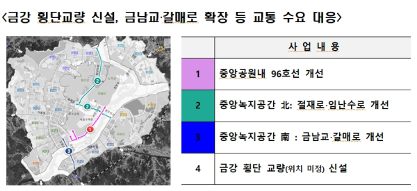 행복청은 최근 금강을 가로지르는 새로운 다리를 건설하기 위한 연구용역과 중앙공원 내 96호선 개선, 금남교‧갈매로 노선 확장 검토에 착수하였다.