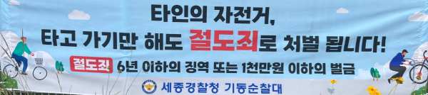 지역경찰과 기동순찰대에서는 취약 시간대와 장소인 16시~19시 학원가 일대에서 집중 거점 및 순찰을 실시하고 있으며, 특히 기동순찰대는 학원가 일대에 ‘타인의 자전거, 타고 가기만 해도 절도죄로 처벌됩니다!’라는 플래카드를 부착하였고, 교육청에 학교 內 전광판 예방 문구 송출 및 포스터 게시, 가정통신문 발송 등을 요청하였다.