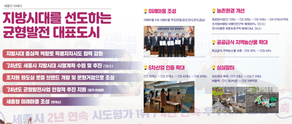 최민호 시장은 취임후 새로운 세종시에 대한 열망 속에 시정 4기가 출범하고 ‘창조와 도전의 미래전략수도 세종’ 비전 달성을 위해 지난 2년간 아무도 가지 않은 창조적, 도전적인 길을 걸어왔다.
