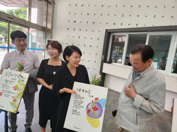 [충청뉴스 최형순 기자] 유성구장애인종합복지관(관장 김영근) 7명의 장애인들이 애송하는 시 작품 7점이 1일 유성구청 1층 로비에 게시돼 잔잔한 감동을 주고 있다.