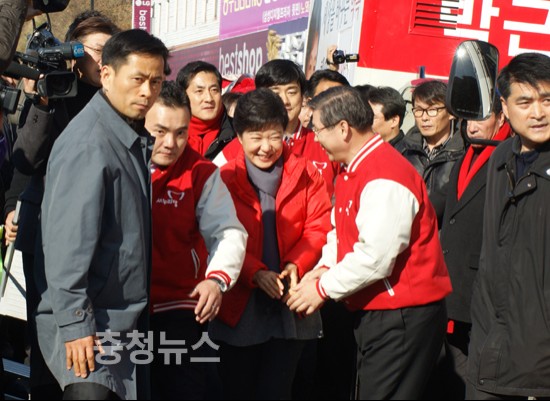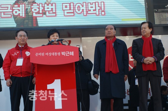 특히 박 후보의 이날 충청 방문에는 박성효, 이재선, 이장우, 홍문표, 김태흠 의원과 최근 합당한 선진통일당의 이인제 전 대표, 그리고 보수진영에 상당한 영향력을 발휘하고 있는 이회창 대표까지 지원유세에 나서 눈길을 끌었다.