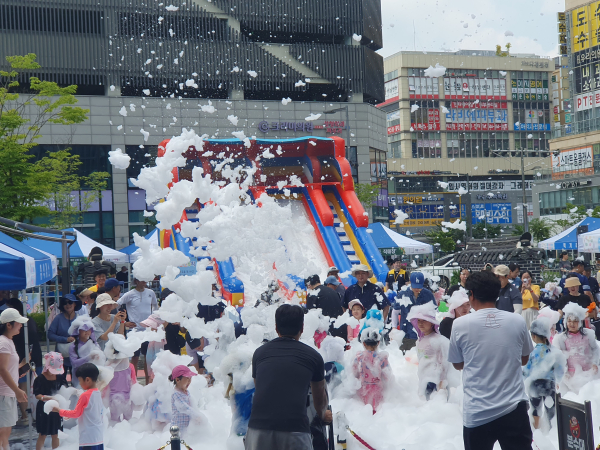 이날 다정동 복컴 광장에서 오전과 오후로 나눠 진행된 물놀이 행사에서는 어린이와 주민 모두 거품 놀이와 분수 터널 등을 이용하며 시원한 물놀이를 즐겼다.
