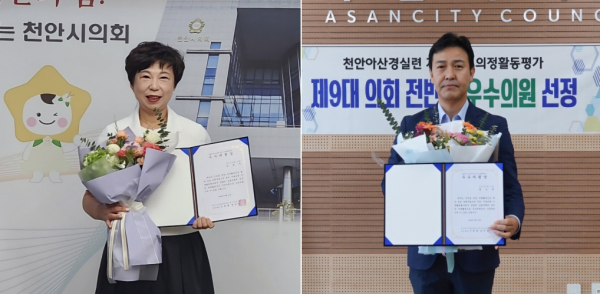 천안아산경실련에 따르면 두 의원은 '제9대 의회 전반기 지방의원 의정활동 평가'에서 탁월한 입법 역량과 행정사무감사, 시정질문 등 우수한 의정활동을 수행한 것으로 평가받았다.