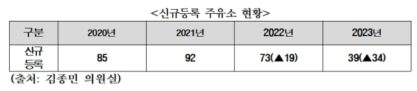 김 의원의 지적대로 신규등록 주유소는 확연히 감소 추세다. 특히 2023년에는 전국에서 39개 주유소만 신규 등록되어 큰 낙폭을 보였다.